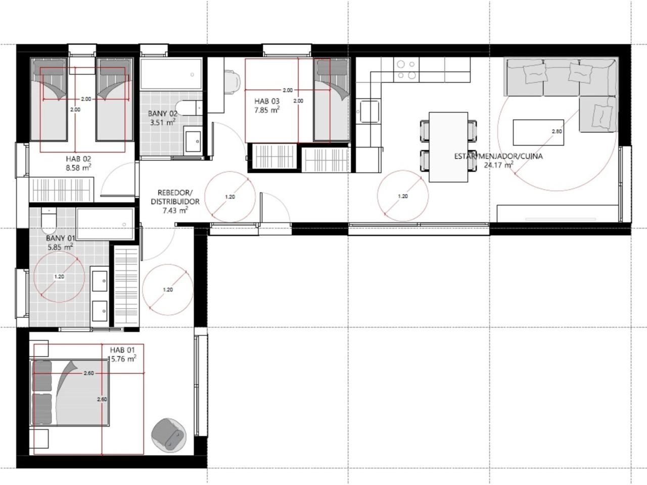Este modelo es totalmente personalizable en distribución y diseño. El precio incluye todo lo necesario para entrar a vivir: proyecto básico y ejecutivo realizado por nuestros arquitectos, dirección de obra, gestión de licencias, construcción modular con estructura de acero y hormigón, transporte e implantación. La vivienda se entrega completamente terminada con climatización por aerotermia, ventilación con recuperador de calor, cocina equipada con electrodomésticos BOSCH, baños completos, armarios empotrados a medida, pavimentos porcelánicos de gran formato, carpinterías de altas prestaciones e iluminación LED integrada.